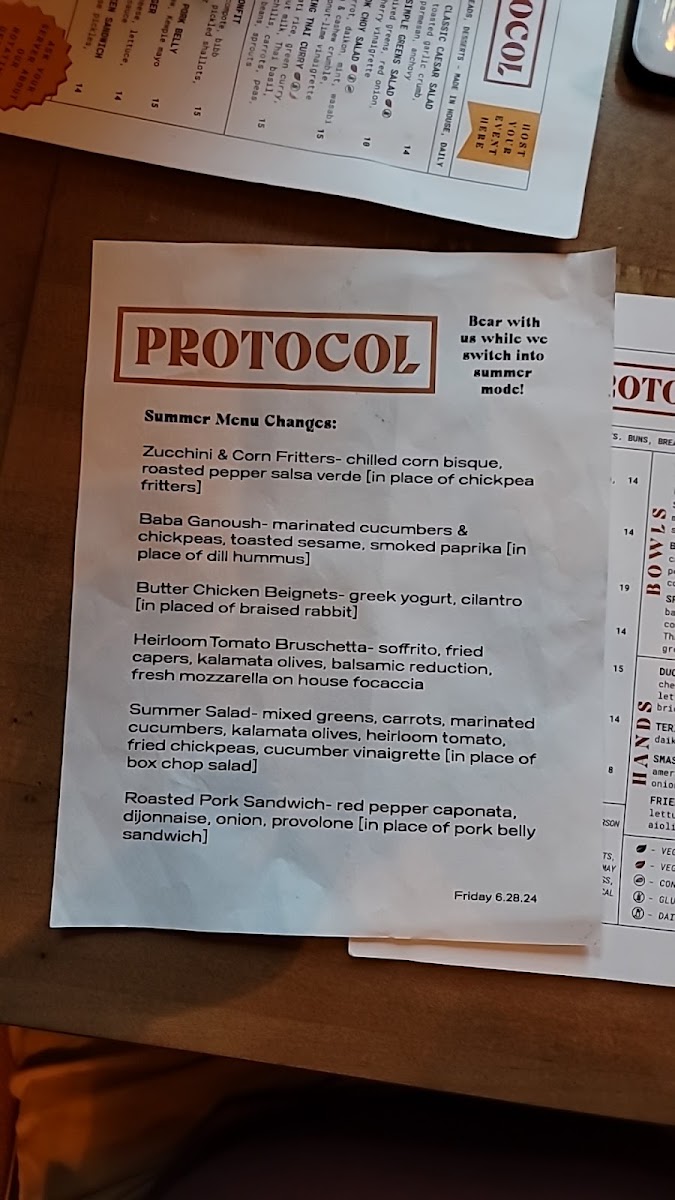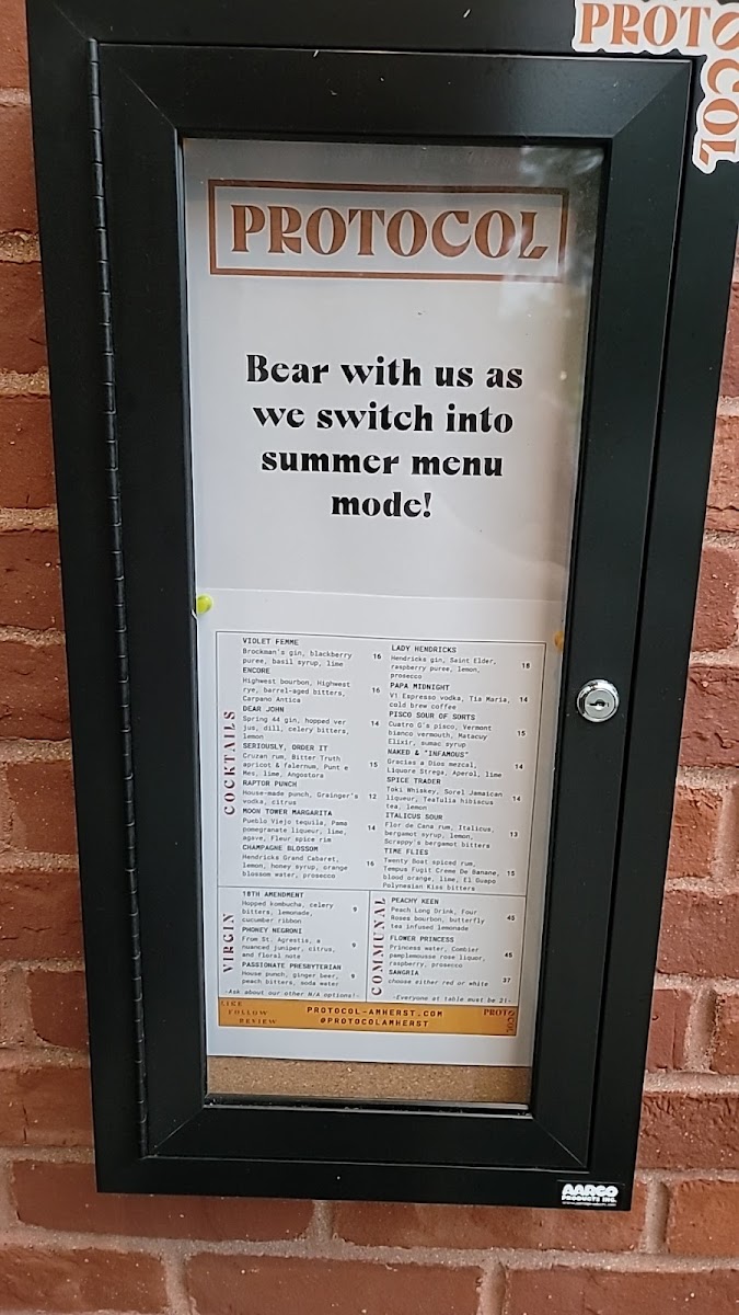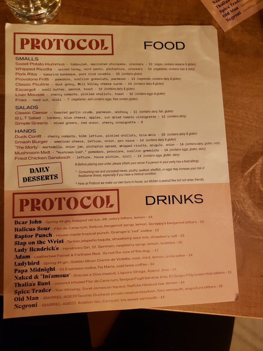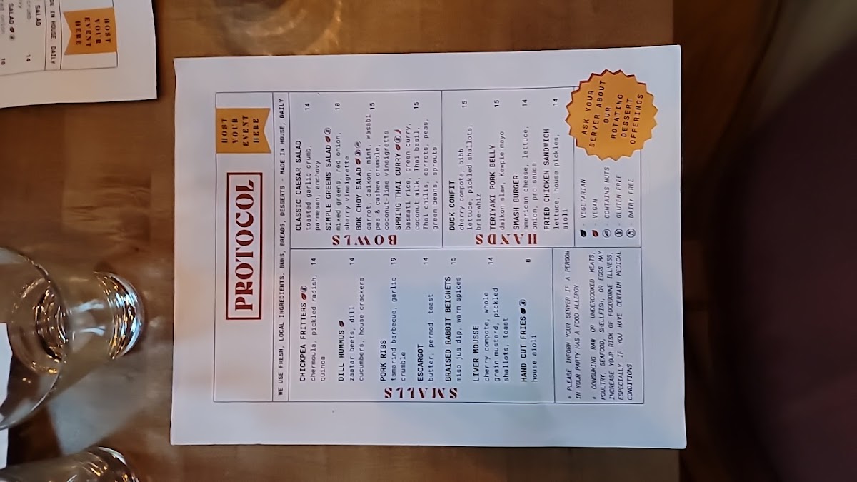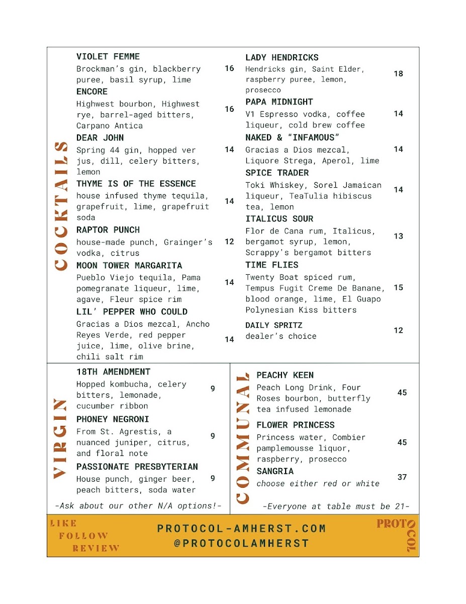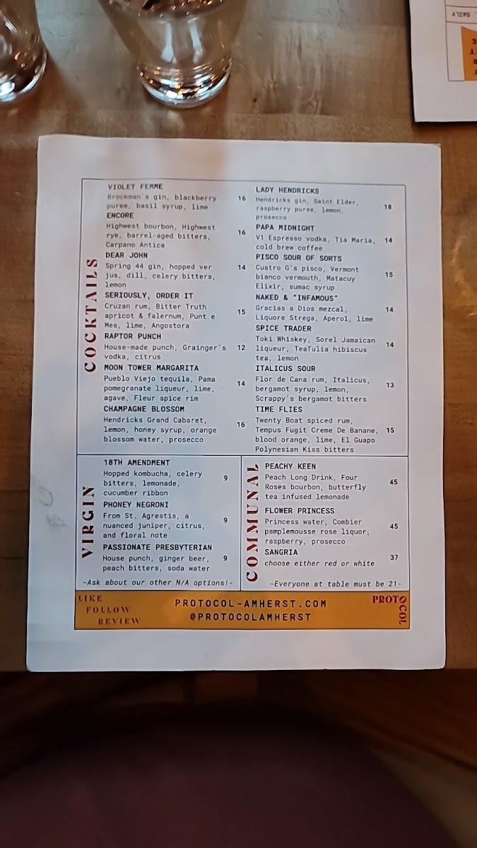 In summary, Protocol Amherst's menu offers something for everyone, from creative small plates to hearty sandwiches and refreshing cocktails. Whether you're in the mood for something light and fresh or rich and indulgent, this menu delivers a memorable dining experience.